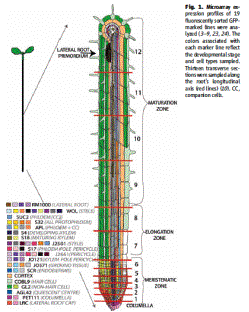 植物の発達制御における転写プログラムは、時間的・空間的に精巧にコントロールされている。発達のプログラムを明らかにすることは、細胞や組織のアイデンティティの獲得を理解するために必要である。シロイヌナズナの根の細胞組織は15の細胞タイプから成り、これらの細胞タイプは静止中心(QC)から起こり、根は放射軸に沿って旋回性に対称な組織化を示す。また、これらの細胞は長軸に沿ってそれぞれに分裂・伸長・分化を経験する。新しい細胞は根端で生まれ、細胞の発生時間は根の長軸に沿ってたどることができる。